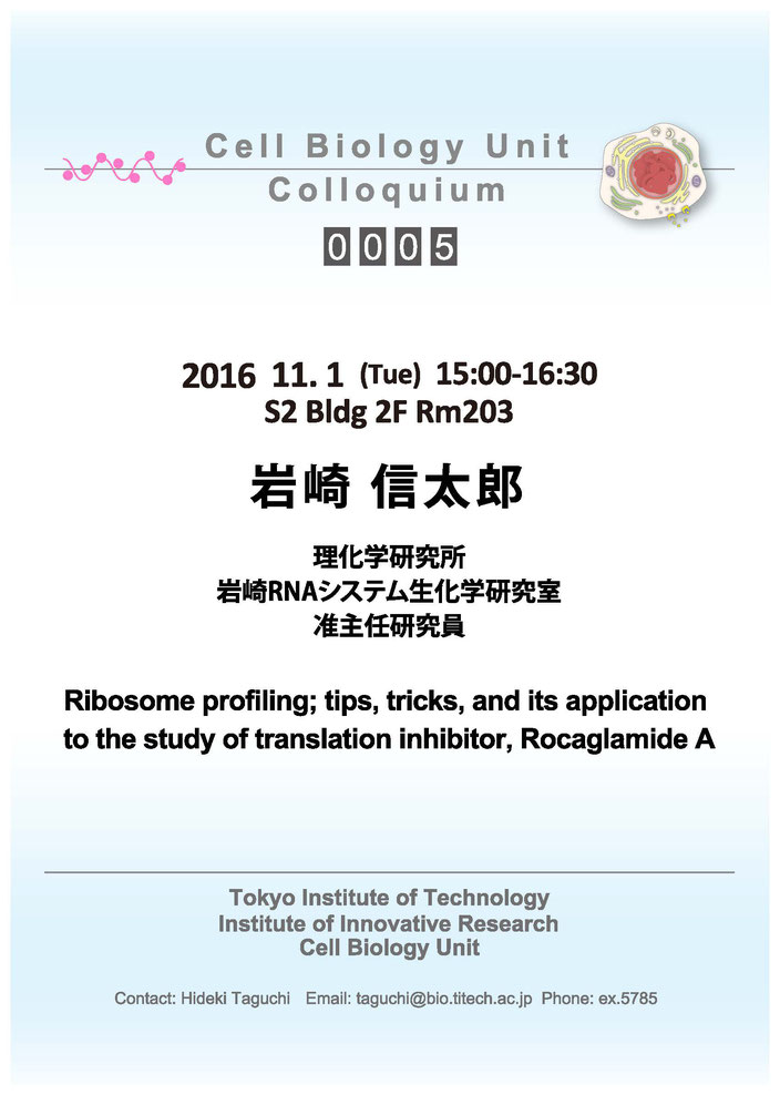 - 2016.11.01 TueCell Biology Center Colloquium 0005岩崎 信太郎 博士 / Ribosome profiling; tips, tricks, and its application to the study of translation inhibitor, Rocaglamide A